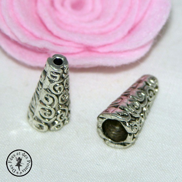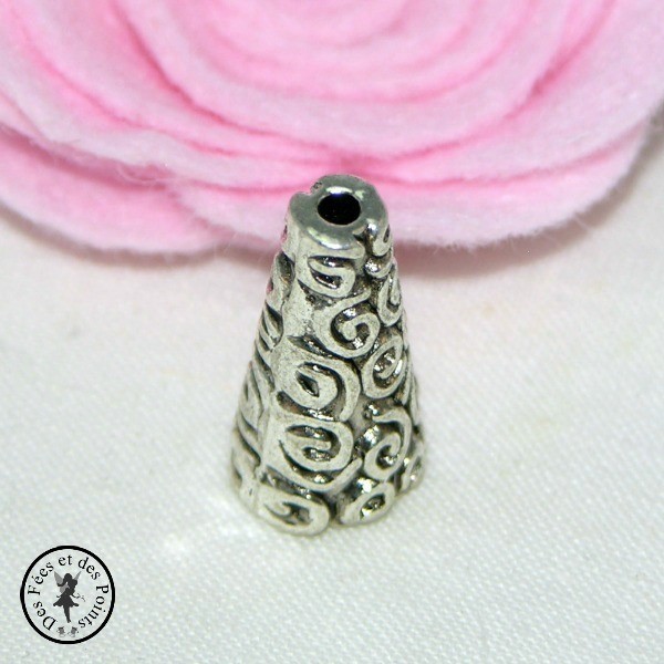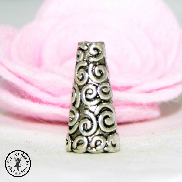 Capuchon métallique de forme cônique avec un motif ajouré façon arabesque à utiliser en bout de lien ou pour réaliser des pompons.