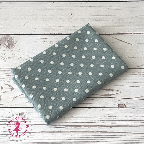 Coupon coton/lin gris bleu avec des pois couleur écru réaliser de jolies petites confections, des sacs et des pochettes.