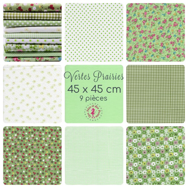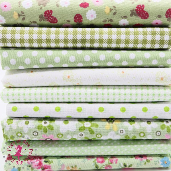 Assortiment de 9 coupons en 100 % coton dans les tons verts pour réaliser de jolies petites confections, idéal également pour le patchwork, le scrapbooking etc