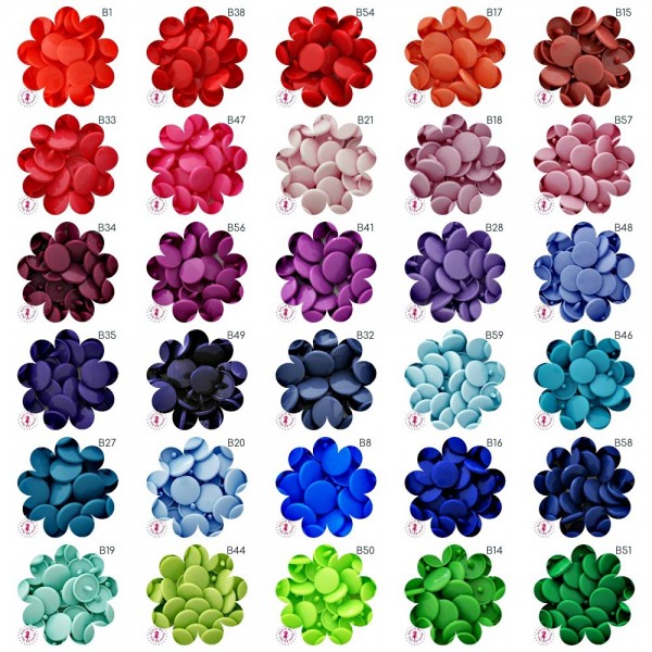 Chaque pression est formée de 4 parties d'une même couleur : 2 chapeaux avec pique, 1 dessous femelle, 1 dessous mâle et se pose uniquement avec la pince KAM ou ZYT. Une explication pour le montage est disponible dans les tutos.
