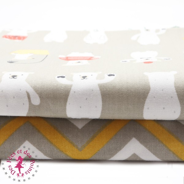 Assortiment de 2 coupons en 100 % coton sergé dans les tons taupe, jaune et blanc pour réaliser de jolies petites confections, idéal également pour le patchwork, le scrapbooking etc