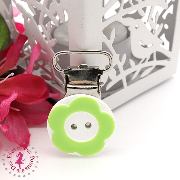 Pince métallique à clipser avec fleur en résine pour la fabrication d’attache-tétine/lolette, d’attache-doudou ou pour vos créations de sacs.