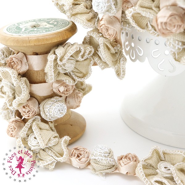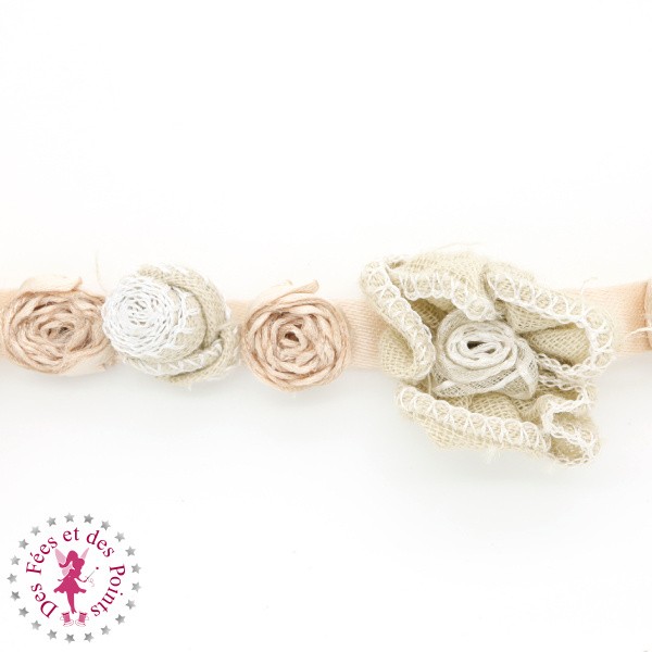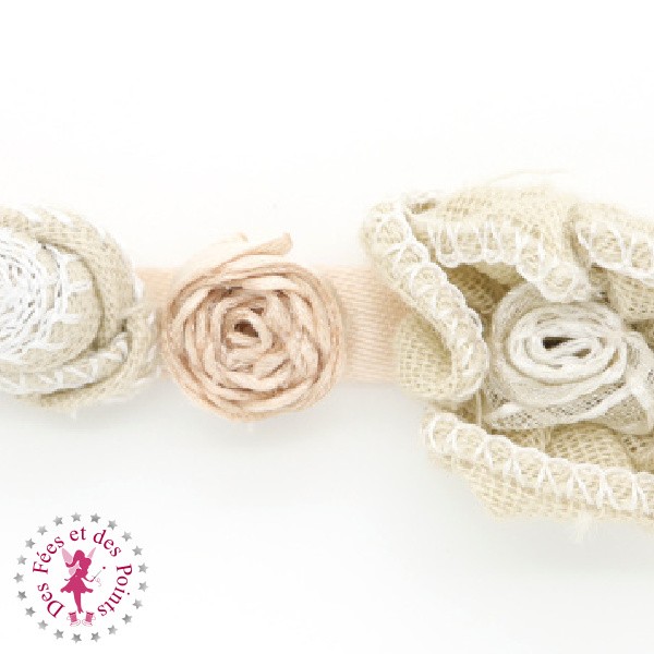 Fleurs tissus en 2 tailles différentes et 3 styles dans les tons beiges, montées sur un ruban en satin.
