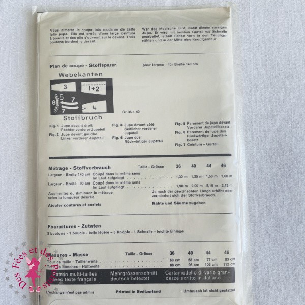 Patron de couture de la marque suisse Ringier pour réaliser une jupe ornée d'une large ceinture à boucle et de plis ouverts sur le devant.
